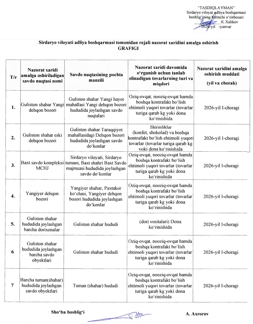 Sirdaryo viloyati adliya boshqarmasi tomonidan 2026-yil I-choragida rejali nazorat xaridini amalga oshirish grafigi